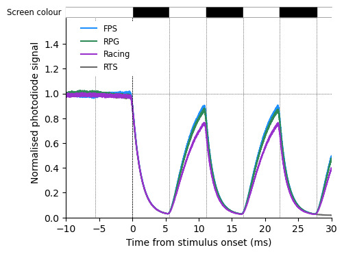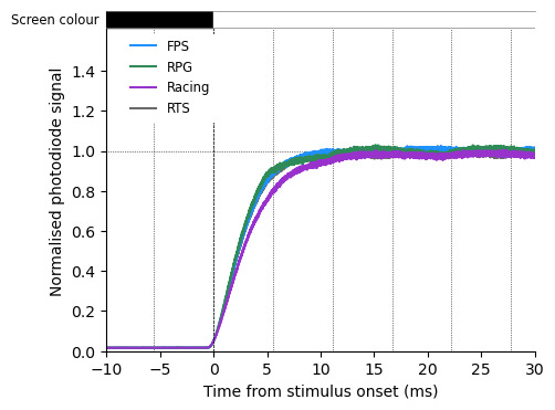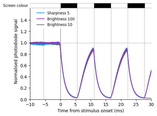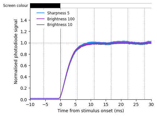 First, I checked that brightness and sharpness do not affect the pixel response time. Obviously, with higher brightness, the luminance is higher, to focus on response time only, I normalised by the steady state value (defined as the 90% percentile of the photodiode signal amplitude when the screen is white).