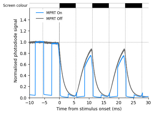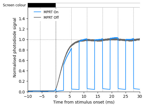 The screens have a 180 Hz refresh rate with 1 ms response time but it’s quite unclear for which of the many modes they offer this performance can be reached. The descriptions on the website and manual are not really informative. In particular, MSI monitors have 4 different gaming modes but apart from some high level description, I couldn’t find what they actually do in practice. It’s clear that they change a bunch of the exposed settings (brightness and co.) and the color balance but they seemed to do more than that. So I tried to fix every parameters I could access and change them one by one and looked at what happens. More precisely, I used a photodiode to measure how fast the screen reached a steady state when switching from white to black. I measured the response to a single step, to see how long it takes to reach steady state, and the response to alternating black and white frames, to see if the luminance is somewhat comparable to the steady state response.