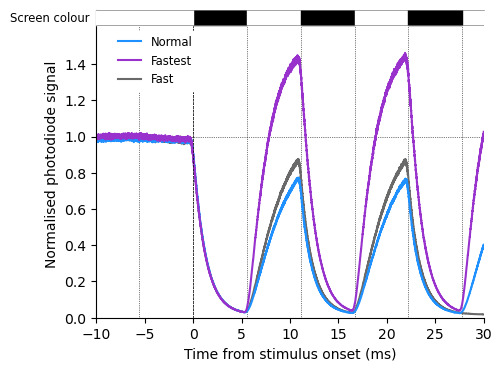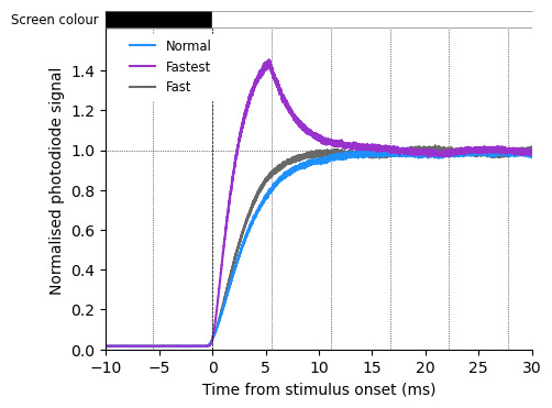 The normal setting takes a bit more than 2 frames to reach steady state, with fast the rise time is reduced to ~1.5 frames, not dramatic but still noticeable. The fastest mode has a large overshoot which make it quite useless.